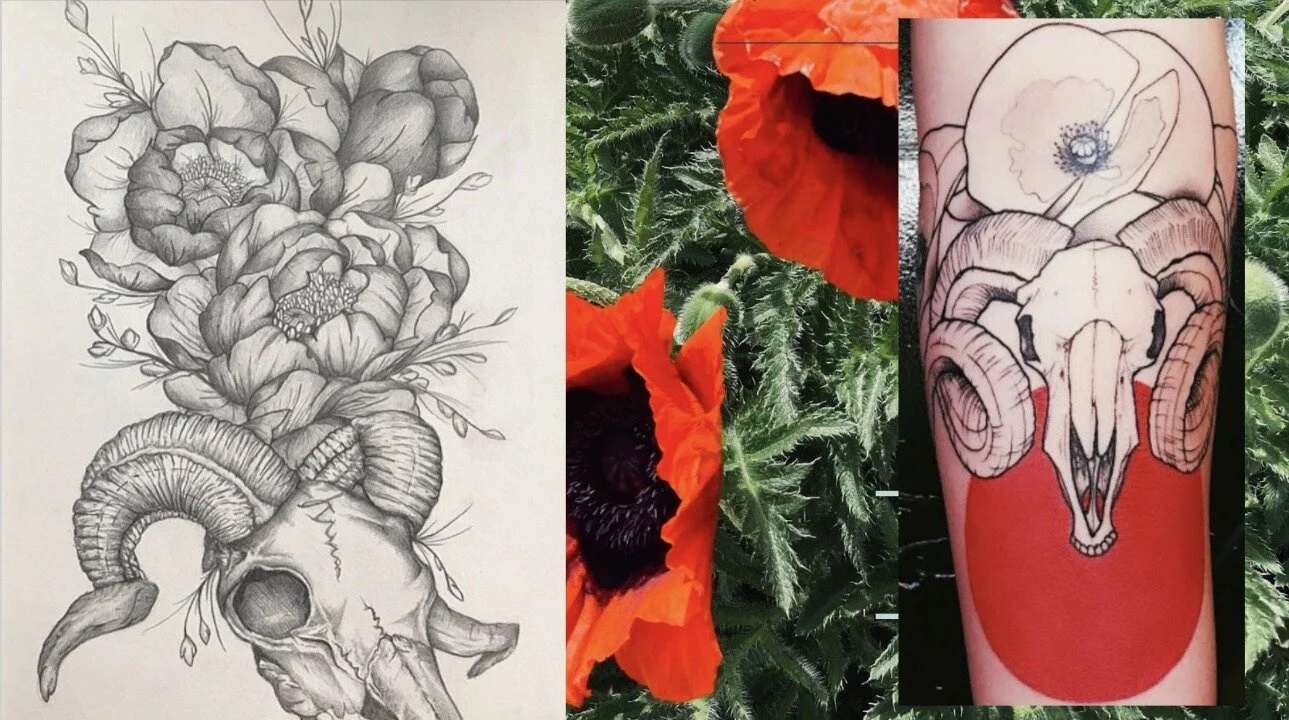 As a child, I spent a portion of every summer in Romania, in the city where my mother grew up, and I would spend hours watching a dubbed version of the PowerPuff Girls on my grandfather's tiny television. At the time, I spoke little to no Romanian, and many of the memories I have of my grandfather are really of his house. The smell of walnuts and brown sugar, two barking dogs (only one of whom liked children) and a small garden filled with flowers, vines and the occasional snail. When my mother escaped Romania in 1989 (only months before the public execution of dictator Nicolae Ceacescu) she was not able to tell her father that she was leaving, and did not know when, if ever, she would be able to return. While I was working on the drawing above, I decided to include an animal skull, as a sort of homage to my father’s Wyoming heritage. After completing the drawing, I hoped to have a similar image tattooed, but when my tattoo artist asked what kind of flower I wanted to include, I did not reference the peonies in my original sketch. Instead I chose poppies. They remind my mother of the fields of poppies back home. With or without a common language, my grandfather’s house, and presence in my life, shaped me and reinforced my ideas of loyalty, love, and obligation. When I see poppies, I am reminded of the strength of my mother, and of the people that never returned to visit the loved ones they were forced to leave behind.